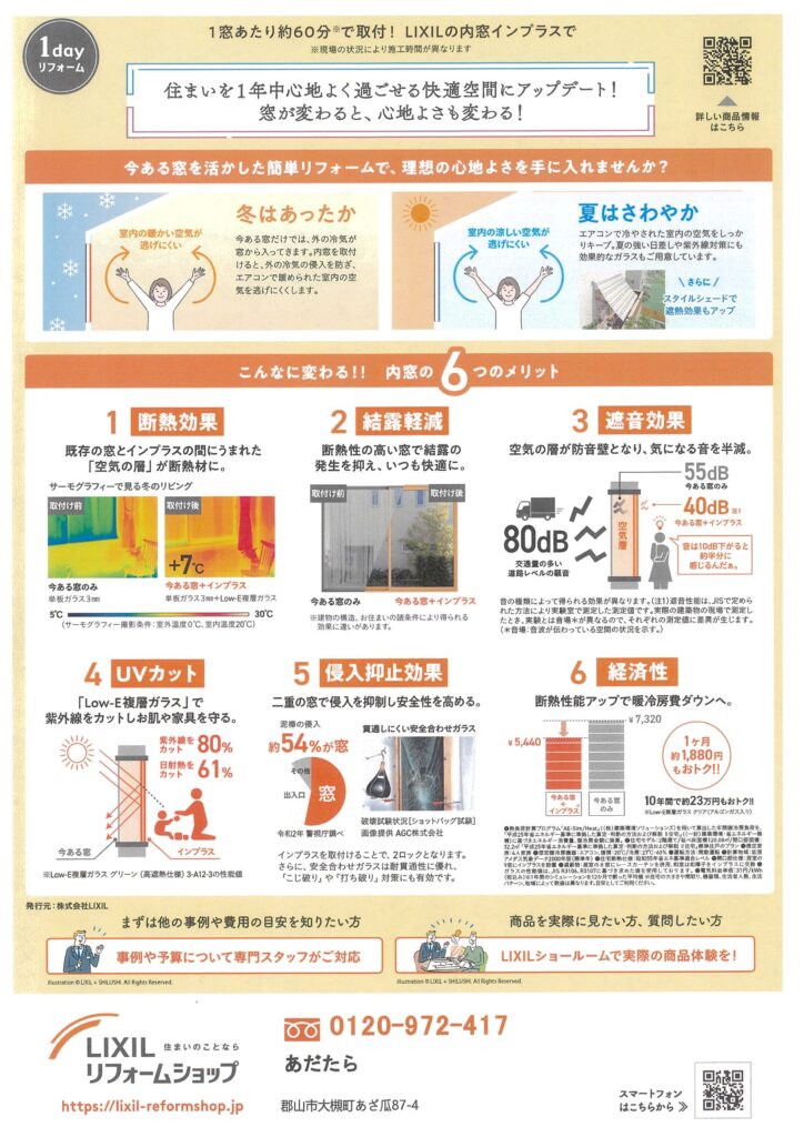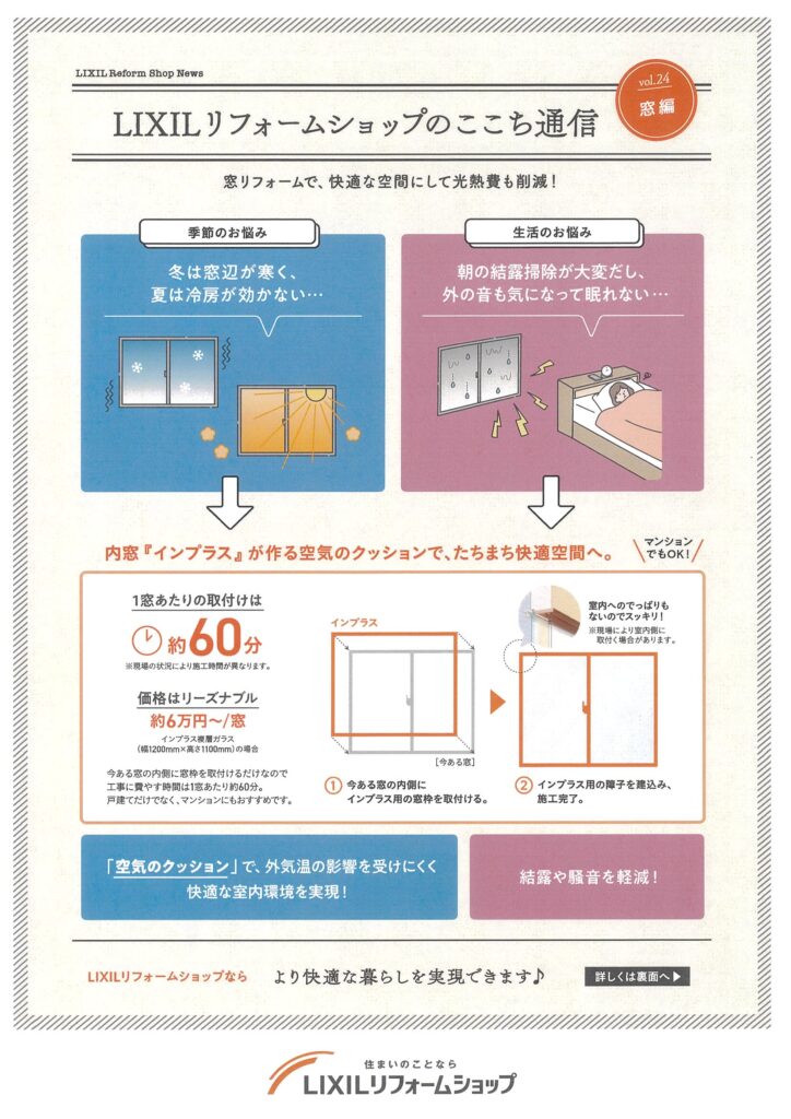 ここち通信 窓編 2026-03-17 お知らせ 窓リフォームで、快適空間にして光熱費も削減! 工事は1窓あたり約1時間で取付完了! 住まいを1年中心地よく過ごせる快適空間に! 窓が変わると、心地よさも変わる!